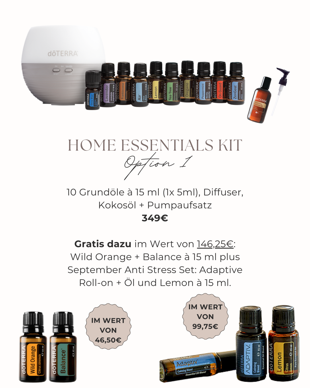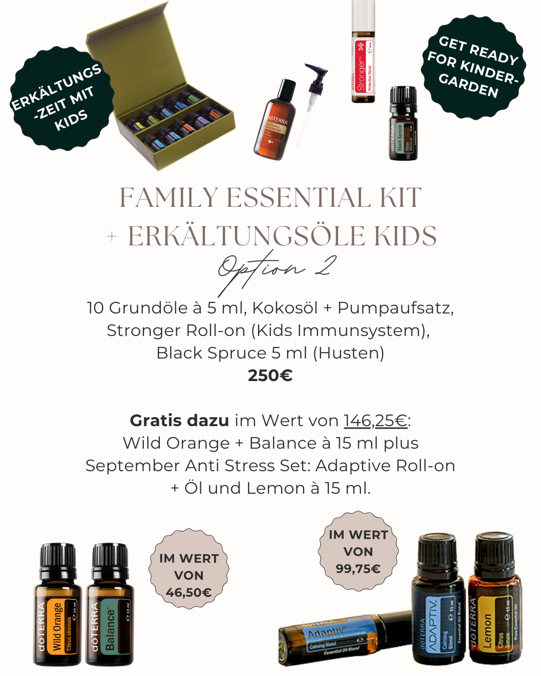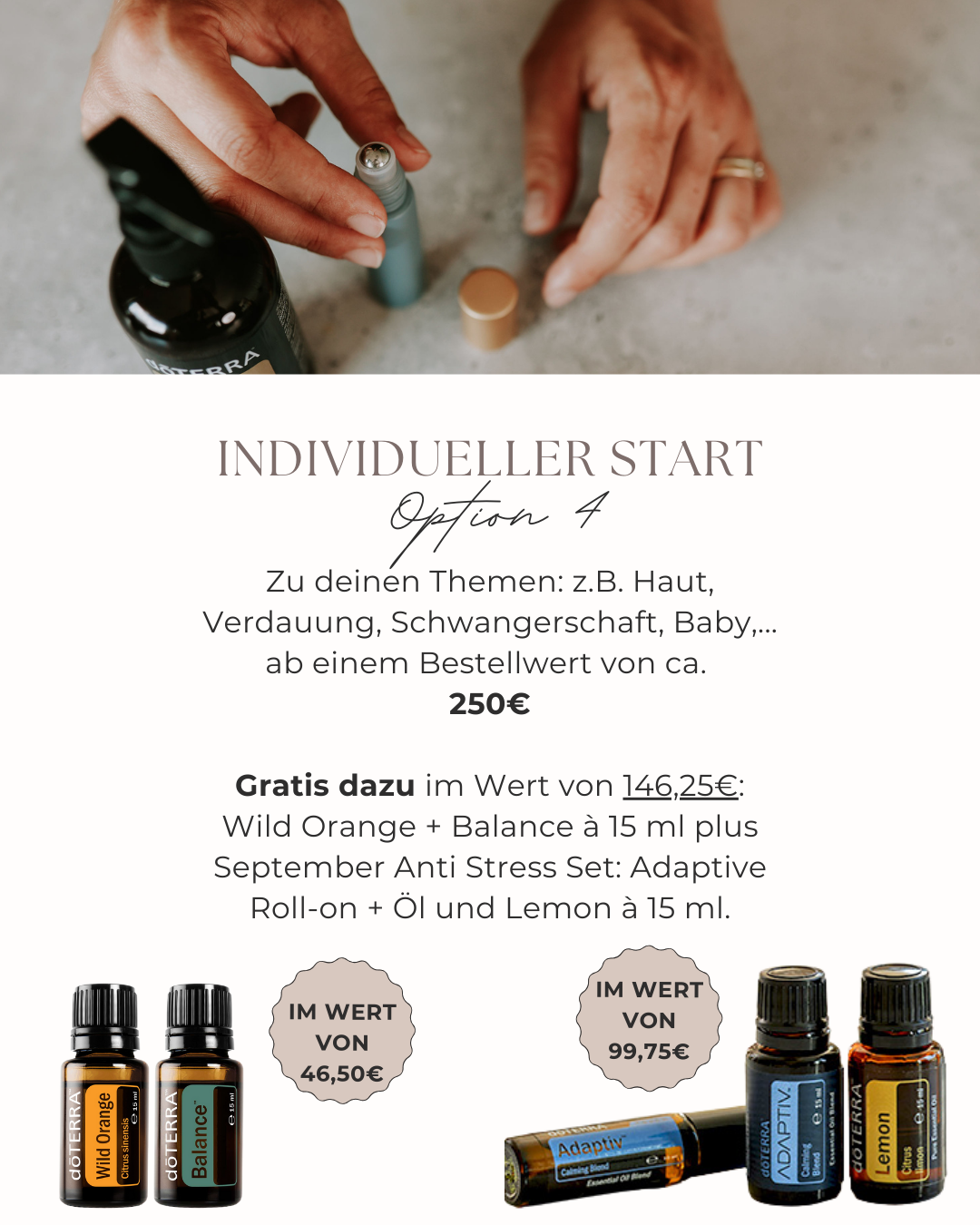 Es gibt 5 Gratis Produkte, wenn du dich diesen Monat für die Öle entscheidest und mit ca. 215€ Mindest-Bestellwert startest. Optionen wie dein Warenkorb aussehen könnte findest du nachfolgend. Wie du bestellst? Melde dich per E-Mail an [email protected] mit deinen Wünschen/Themen/Fragen und wir schauen gemeinsam welche Öle für deinen Start am besten sind. Typisch ist eines der nachfolgenden Sets, aber es ist immer individuell. Hast du dich dann entschieden, sende ich dir einen Bestell-Link und du kannst dich auf dein Öle-Päckchen freuen!